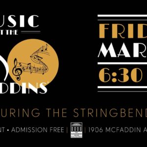 Music at the McFaddins’ Outdoor Concert Featuring The Stringbenders Join us on Friday, March 27 for Music at the ... 27 Mar 6:30 pm - 8:00 pm McFaddin-Ward House Lawn1906 Calder Avenue