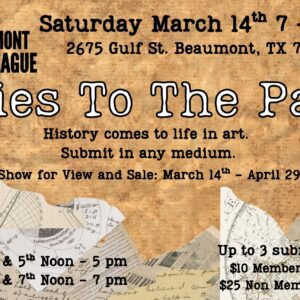 Ties to the Past at the Beaumont Art League History comes to life in art. Submit in any medium. Artist ... 14 Mar - 29 Apr 7:00 pm - 9:00 pm Beaumont Art League2675 Gulf Street, Beaumont, Texas 77703