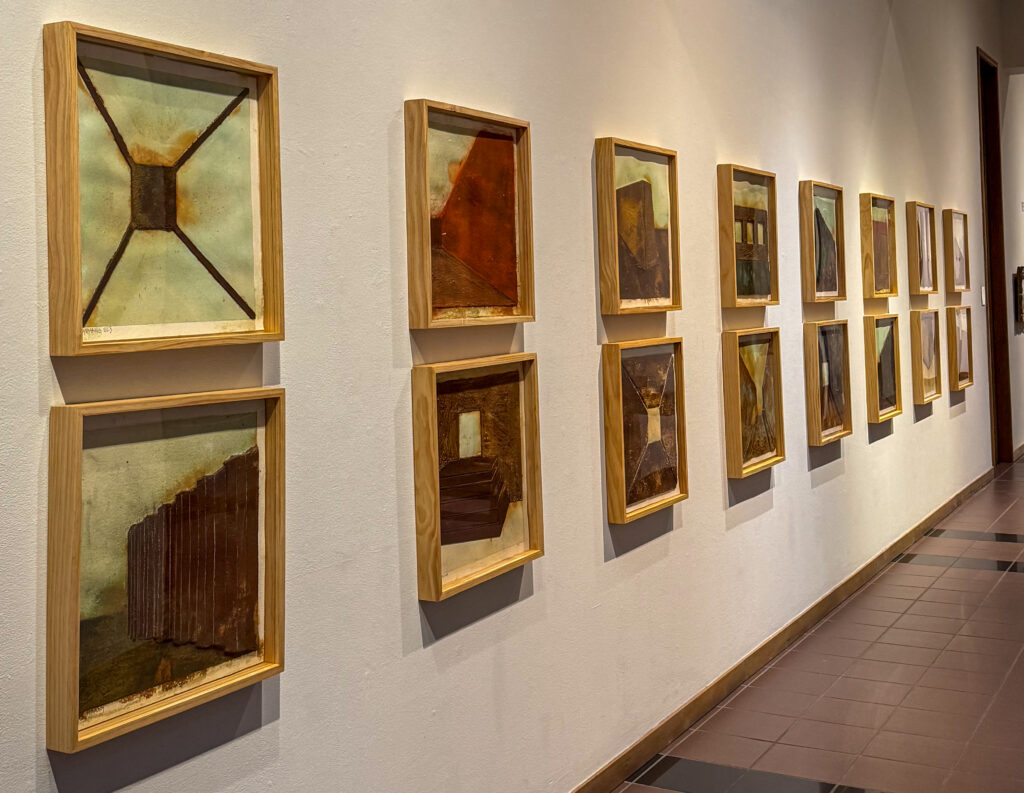 Once the largest Pre-Columbian city in South America, it is estimated that over 60,000 people lived in and around Chan Chan. Chan Chan was divided into 9 walled citadels, each constructed out of adobe brick and then finished with mud. The citadels were sub-divided into temples, dwellings, storehouses, orchards, cemeteries, gardens, reservoirs, and symmetrically arranged rooms, all for the aristocracy. Most of the city’s population lived outside of the citadels’ walls. In 1986, Chan Chan was added to UNESCO’s list of World Heritage sites. In his Chan Chan Drawings series, Dyrhaug explores architectural forms, space, and texture utilizing gesso, sand, metal coatings and patinas to bring renewed life to the city’s ancient walls.