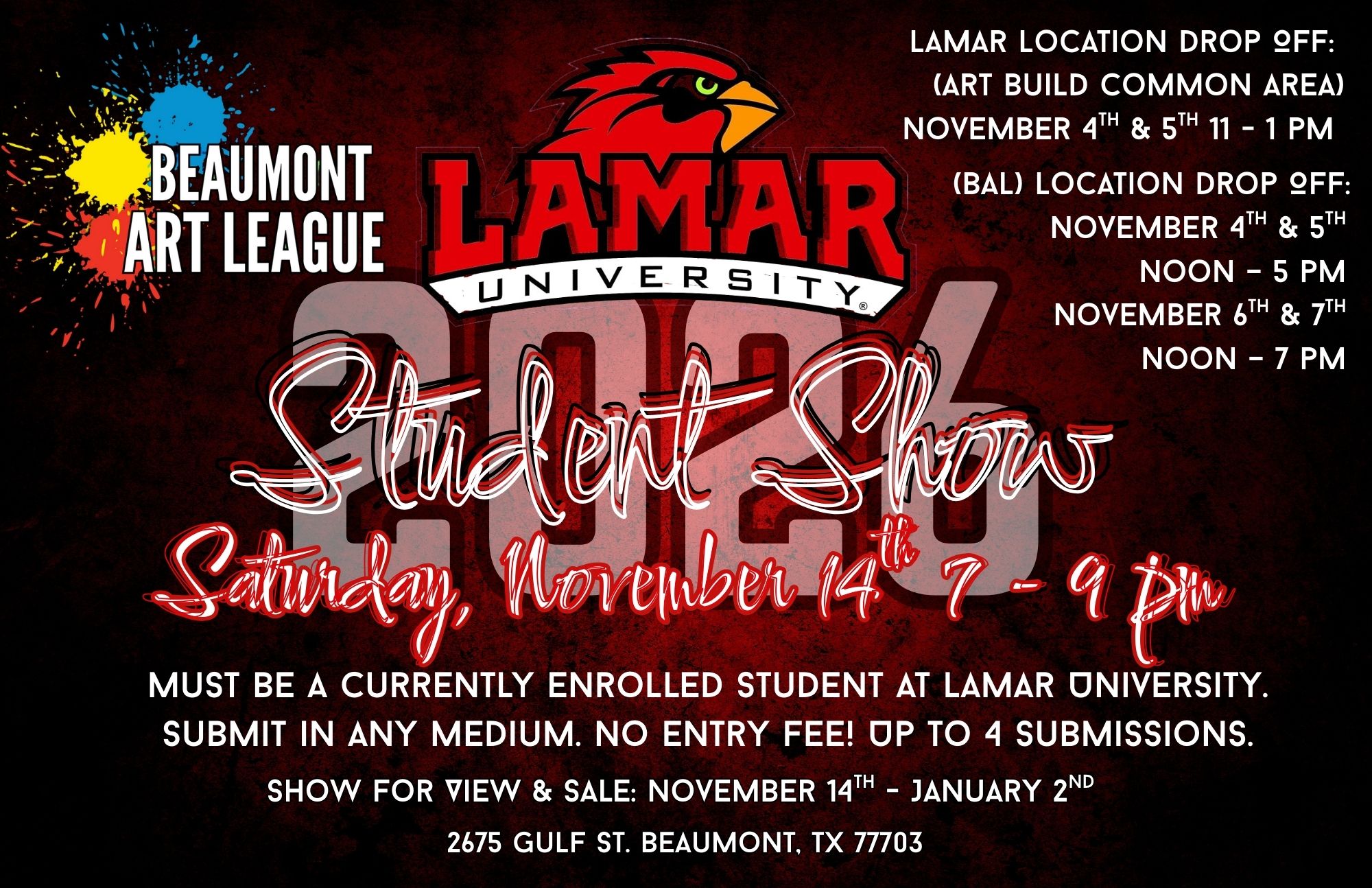 Must be a current enrolled student at Lamar University. Submit in any medium.