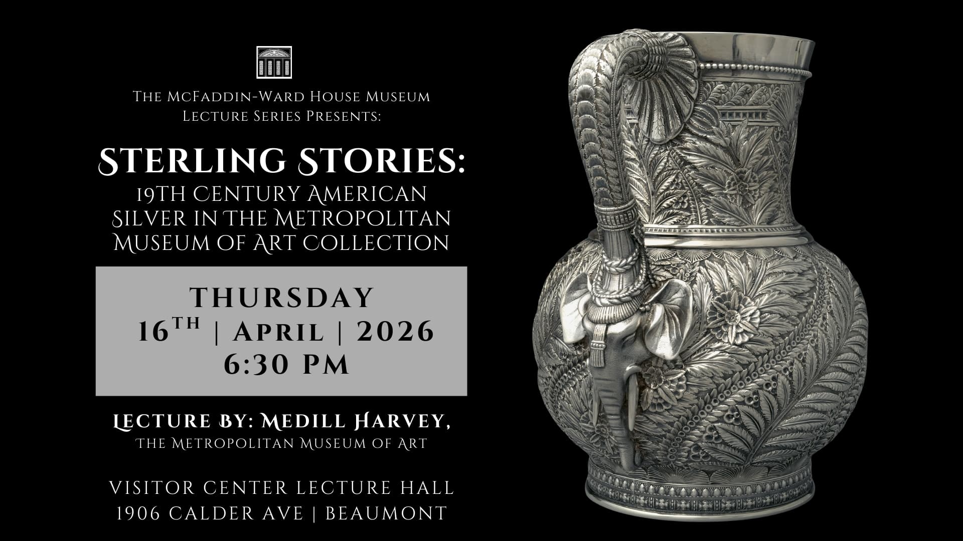 Join the McFaddin-Ward House Museum for “Sterling Stories: 19th Century American Silver in The Metropolitan Museum of Art Collection,” a free public lecture presented by Medill Harvey on Thursday, April 16, at 6:30 p.m. in the Museum’s Visitor Center Lecture Hall (1906 Calder Avenue, Beaumont).